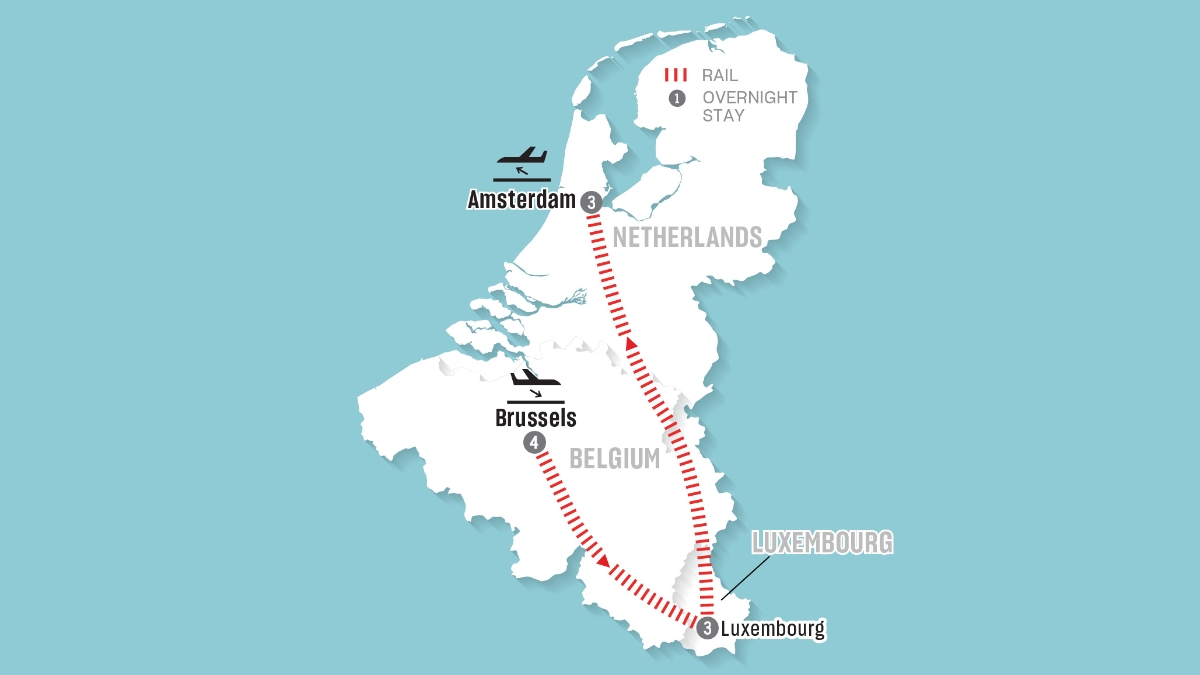 Experience the charm of Brussels, Luxembourg City and Amsterdam on this captivating European journey. From the stunning Grand Place and Atomium in Brussels to the historic streets and viewpoints of Luxembourg City to the scenic canals and world-class art of Amsterdam, this itinerary offers a perfect blend of culture, history and culinary delights for an unforgettable adventure.