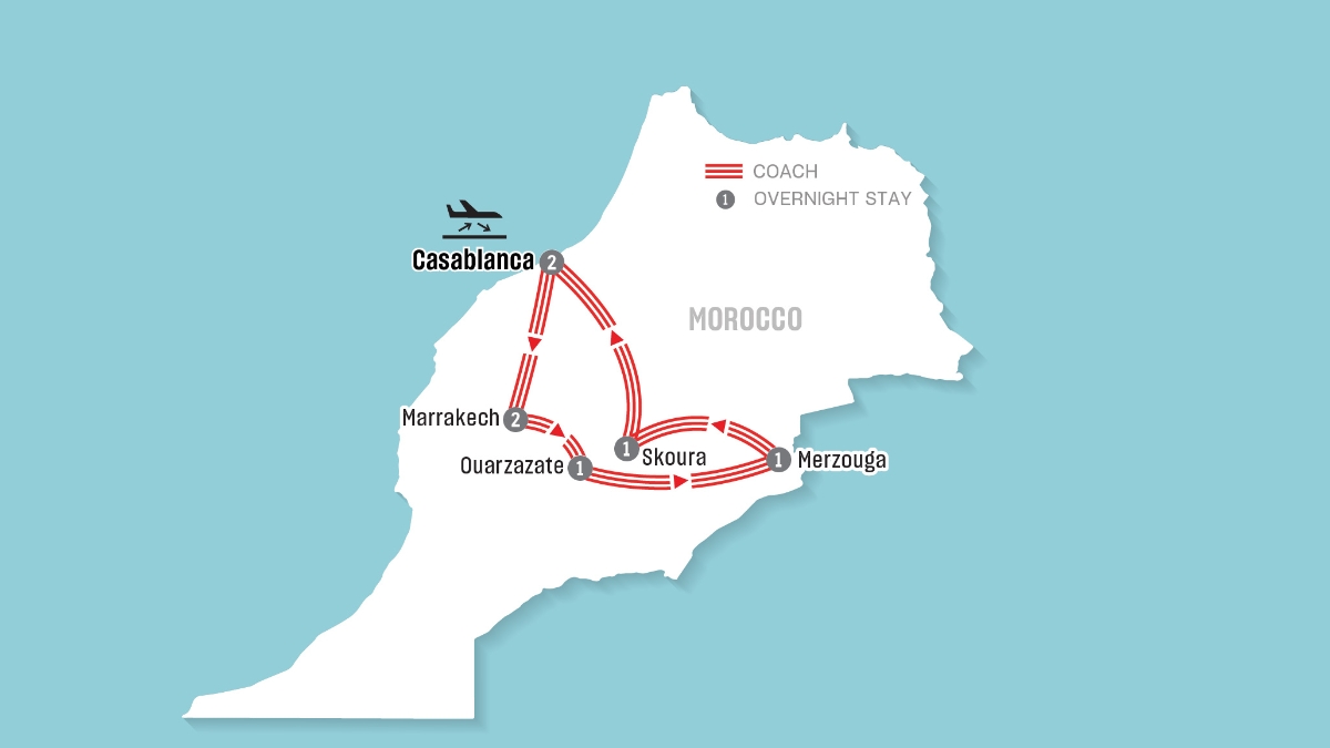 Embark on an unforgettable journey through Morocco, a land of vibrant cities, dramatic landscapes and timeless culture. From the bustling streets of Casablanca and the enchanting medina of Marrakech to the cinematic scenery of Ouarzazate and the golden dunes of the Sahara Desert, this 9-day adventure blends history, nature and authentic local experiences.