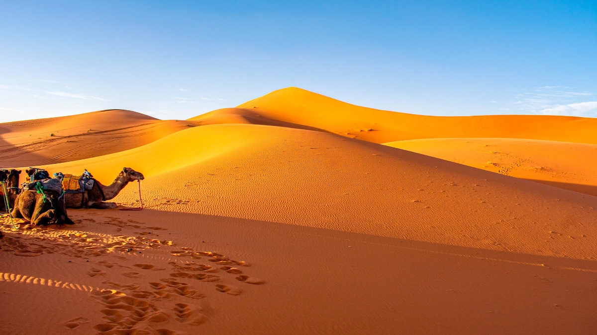 After breakfast, you’ll depart for Merzouga via the spectacular Todra Gorges, a dramatic canyon of soaring limestone cliffs and lush oasis scenery. You’ll continue through Erfoud, renowned for its Medjool dates and prehistoric fossils, before reaching Merzouga. You’ll transfer by 4x4 to your desert camp, where you will enjoy dinner under the stars and an overnight stay in a comfortable desert bivouac with private facilities.