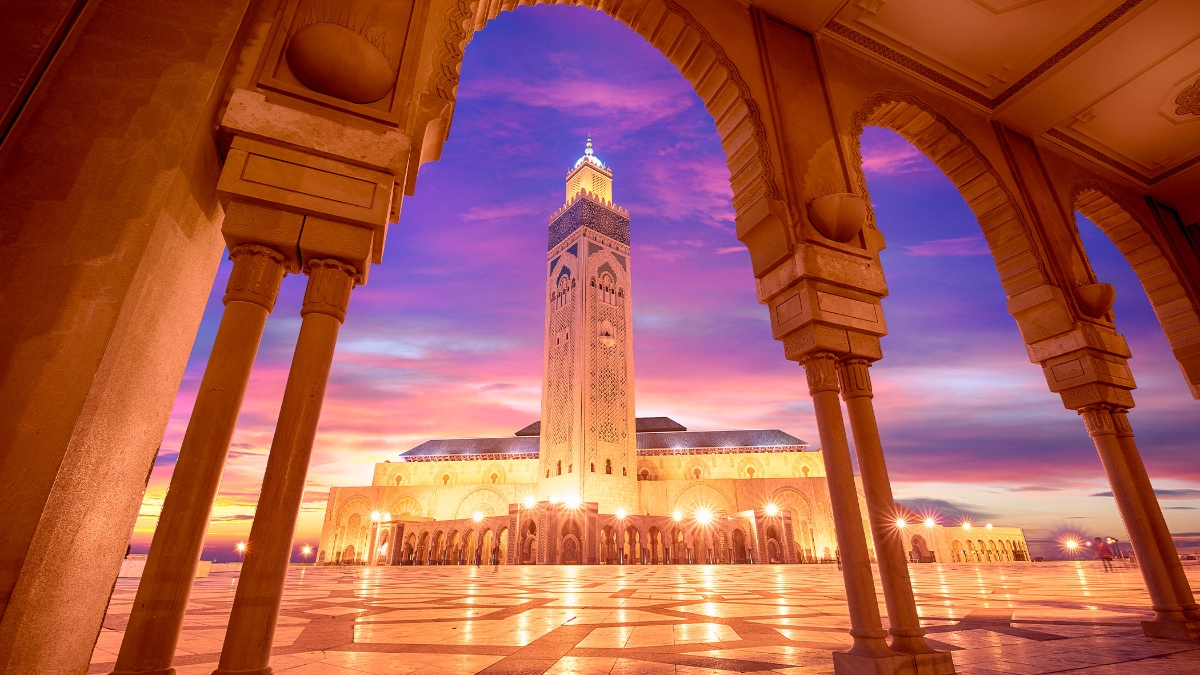 In the late afternoon, depart for Casablanca and enjoy a panoramic tour of the city. Admire the majestic Hassan II Mosque (exterior visit), its grand minaret and intricate façade illuminated by the golden evening light, creating a striking silhouette against the Atlantic Ocean.