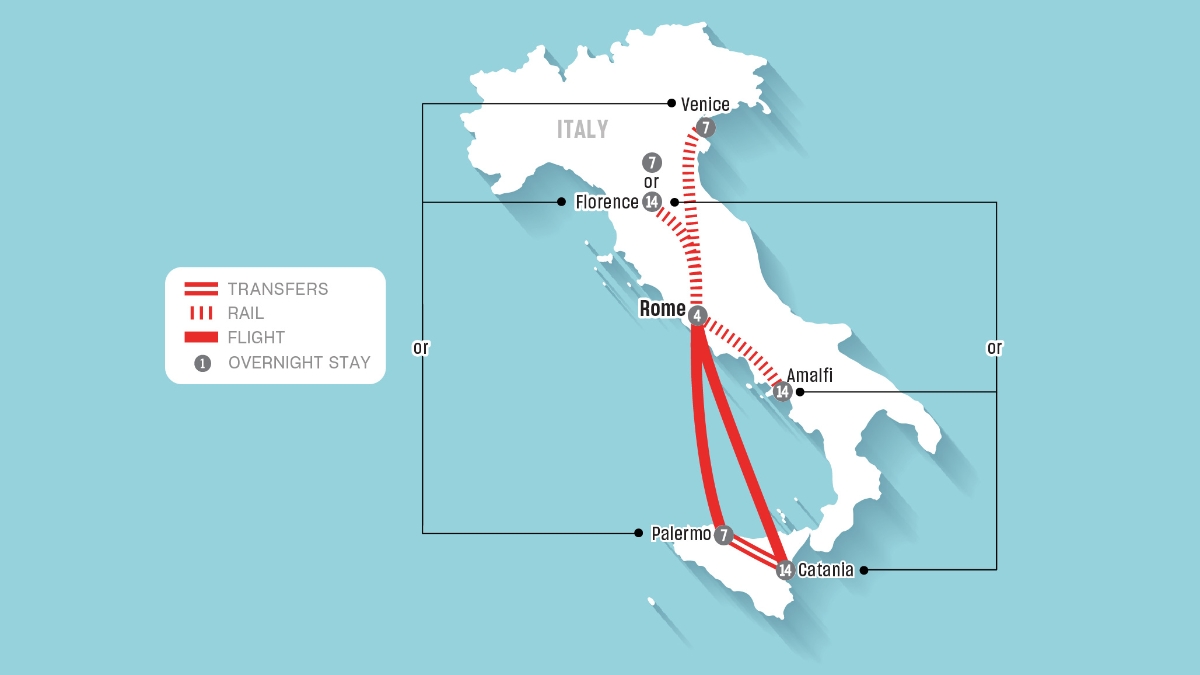 If you choose the Sicily option, a local flight from Rome to Palermo and a return flight from Catania to Rome are included, along with round-trip transfers between your hotels and the airports.