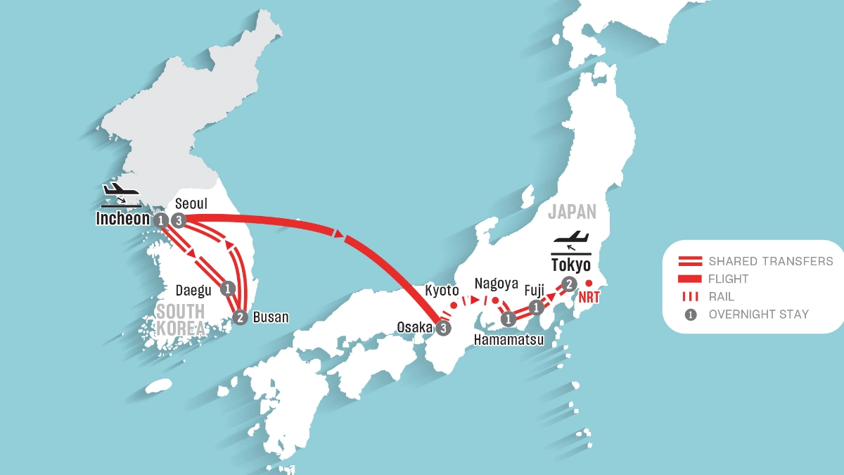 - 14-nights Superior accommodation with meal inclusions according to itinerary (1 night Incheon, 1 night Daegu, 2 nights Busan, 3 nights Seoul, 3 nights Osaka, 1 night Hamamatsu, 1 night Fuji, 2 nights Tokyo)