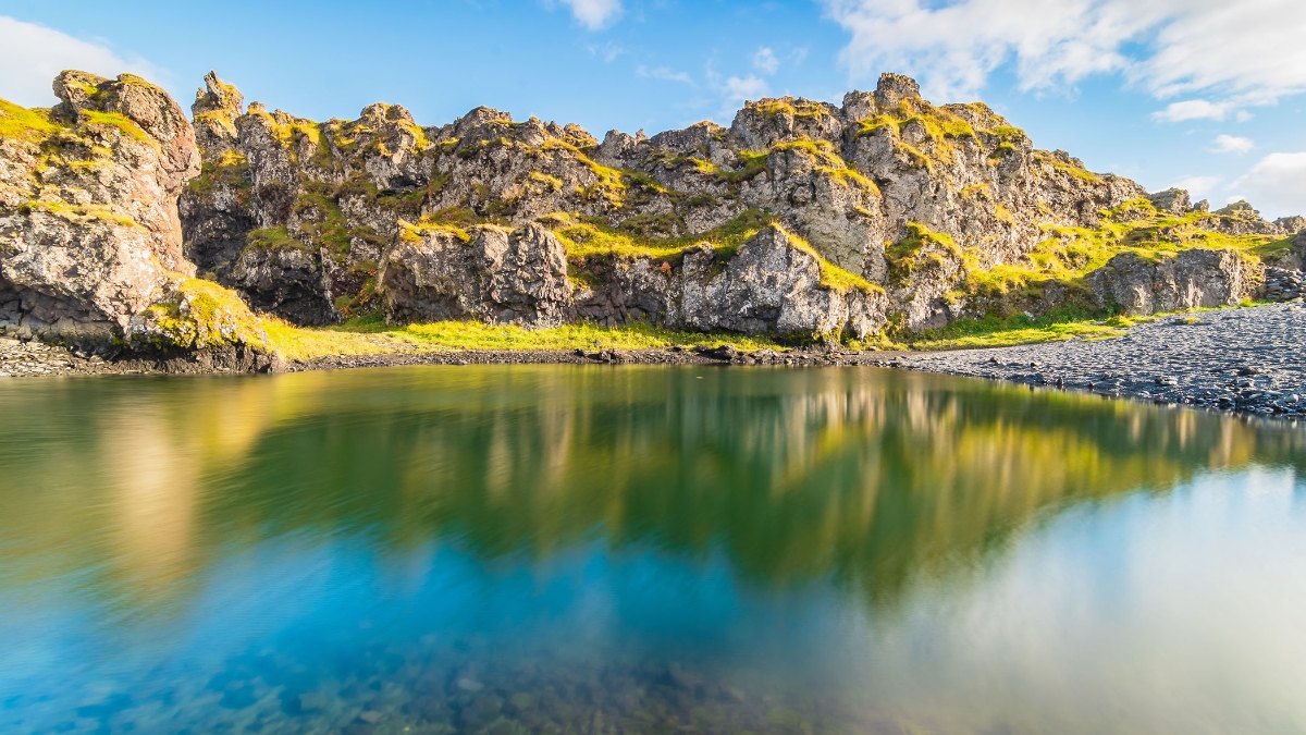 Afterwards, you’ll travel around the Tjörnes Peninsula along a road that overlooks the waters of the Arctic Ocean before descending towards Öxarfjörður Bay. Once you’ve arrived, you can go for a stroll in Ásbyrgi, an impressive horseshoe-shaped gorge and former bed of the great glacial river Jökulsá á Fjöllum. Next, you’ll cross the desert regions of Möðrudalsöræfi to reach the more fertile region of Hérað and Lake Lagarfljót.