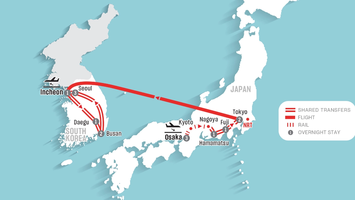 - 14-nights Superior accommodation with meal inclusions according to itinerary (3 nights Osaka, 1 night Hamamatsu, 1 night Fuji, 2 nights Tokyo, 1 night Incheon, 1 night Daegu, 2 nights Busan, 3 nights Seoul)