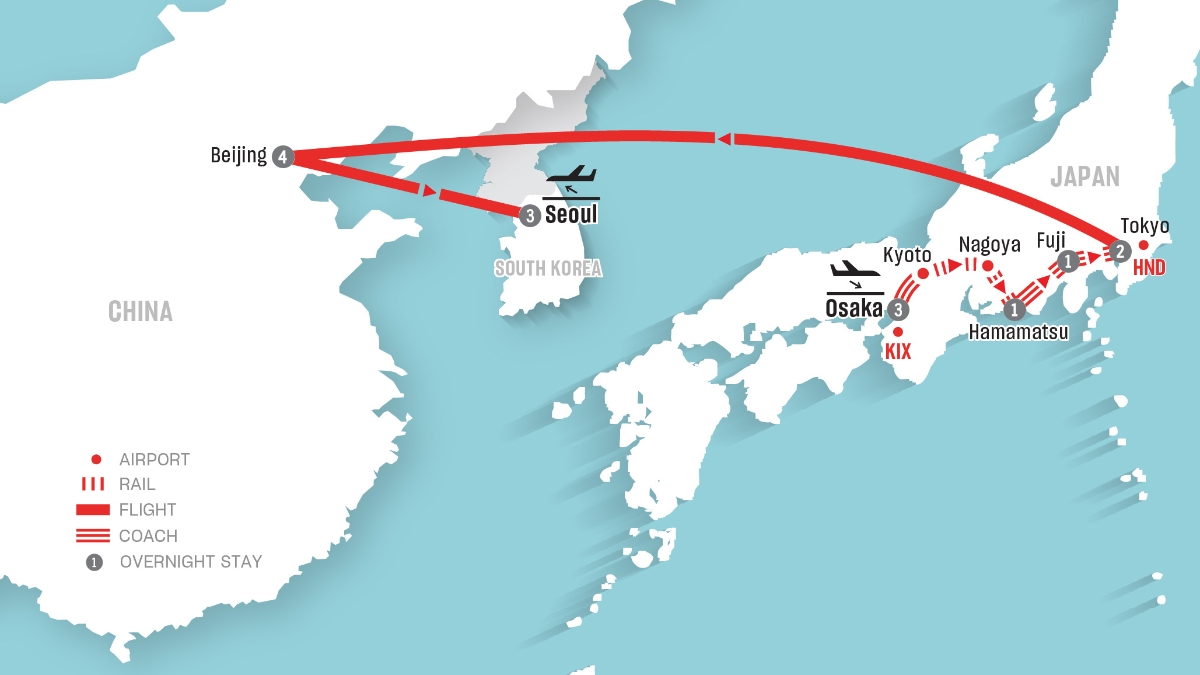 - 14 nights in Superior Accommodation (3 nights in Osaka, 1 night in Hamamatsu, 1 night in Fuji, 2 nights in Tokyo, 4 nights in Beijing, 3 nights in Seoul)