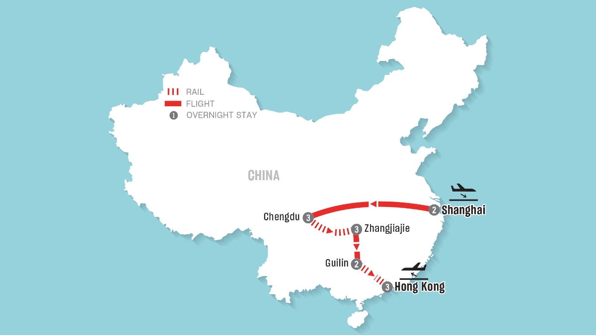 - 13 nights accommodation in Superior category (2 nights in Shanghai, 3 nights in Chengdu, 3 nights in Zhangjiajie, 2 nights in Guilin, 3 nights in Hong Kong)